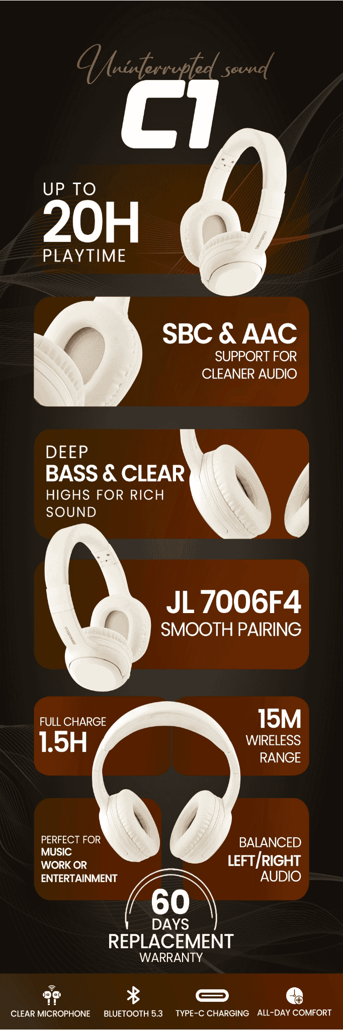 Enjoy stable connectivity and high-quality audio with the ZHOBANCO C1. Featuring inbuilt ENC & Bluetooth 5.3, SBC/AAC decoding, up to 20 hours playtime, and fast 1.5-hour charging for 20 hours of comfort.