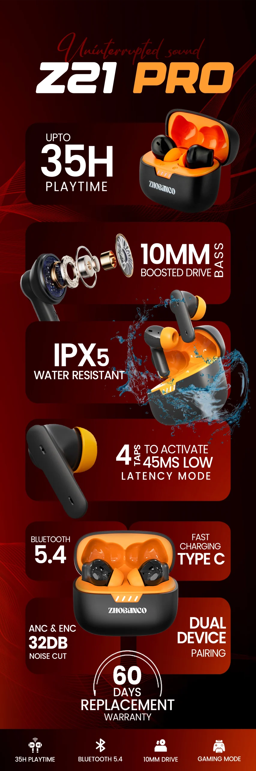 Experience pure audio bliss with the ZHOBANCO Z21 PRO: hybrid ANC, crisp ENC mic clarity, up to 36 hours of playtime, and a 60-day replacement guarantee